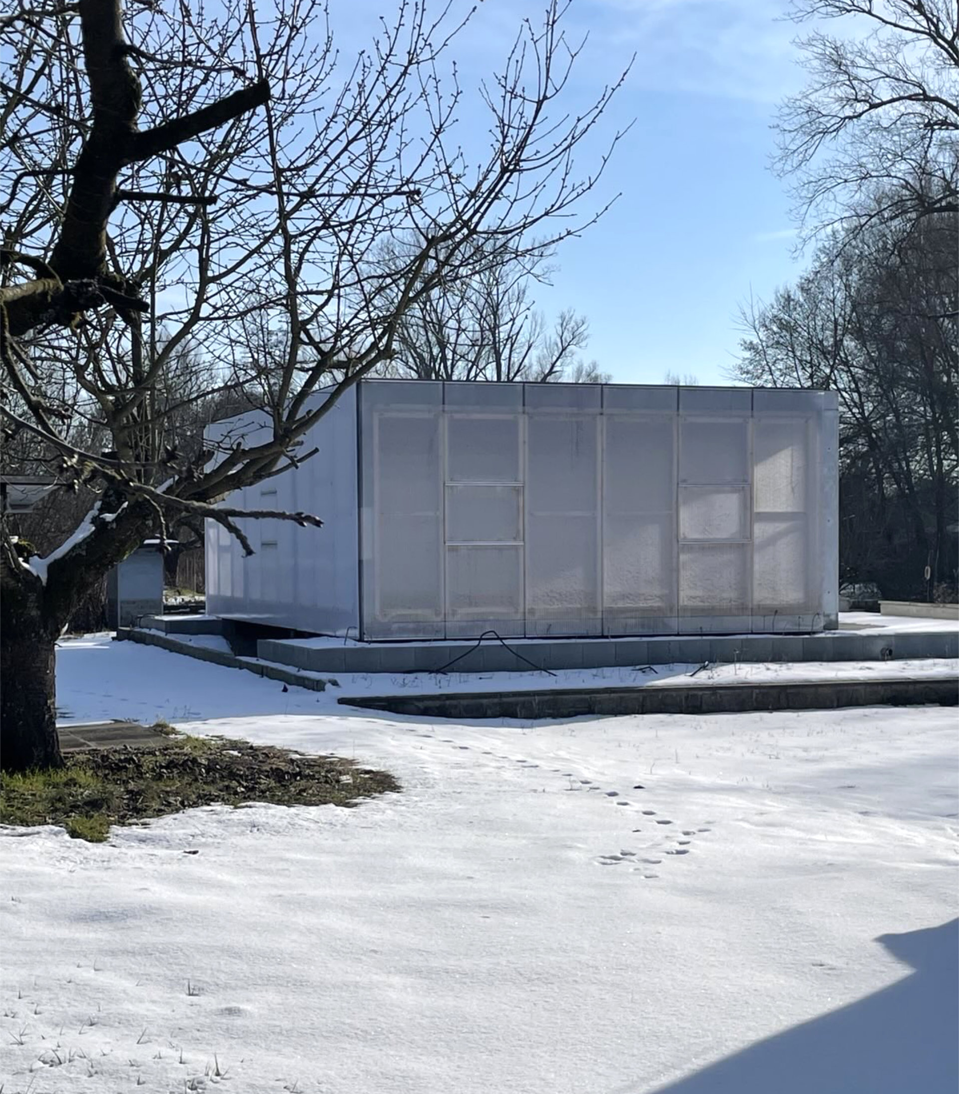 Die Gebäudehülle aus Holzrahmen mit 16mm Doppelstegplatten ist fertiggestellt.